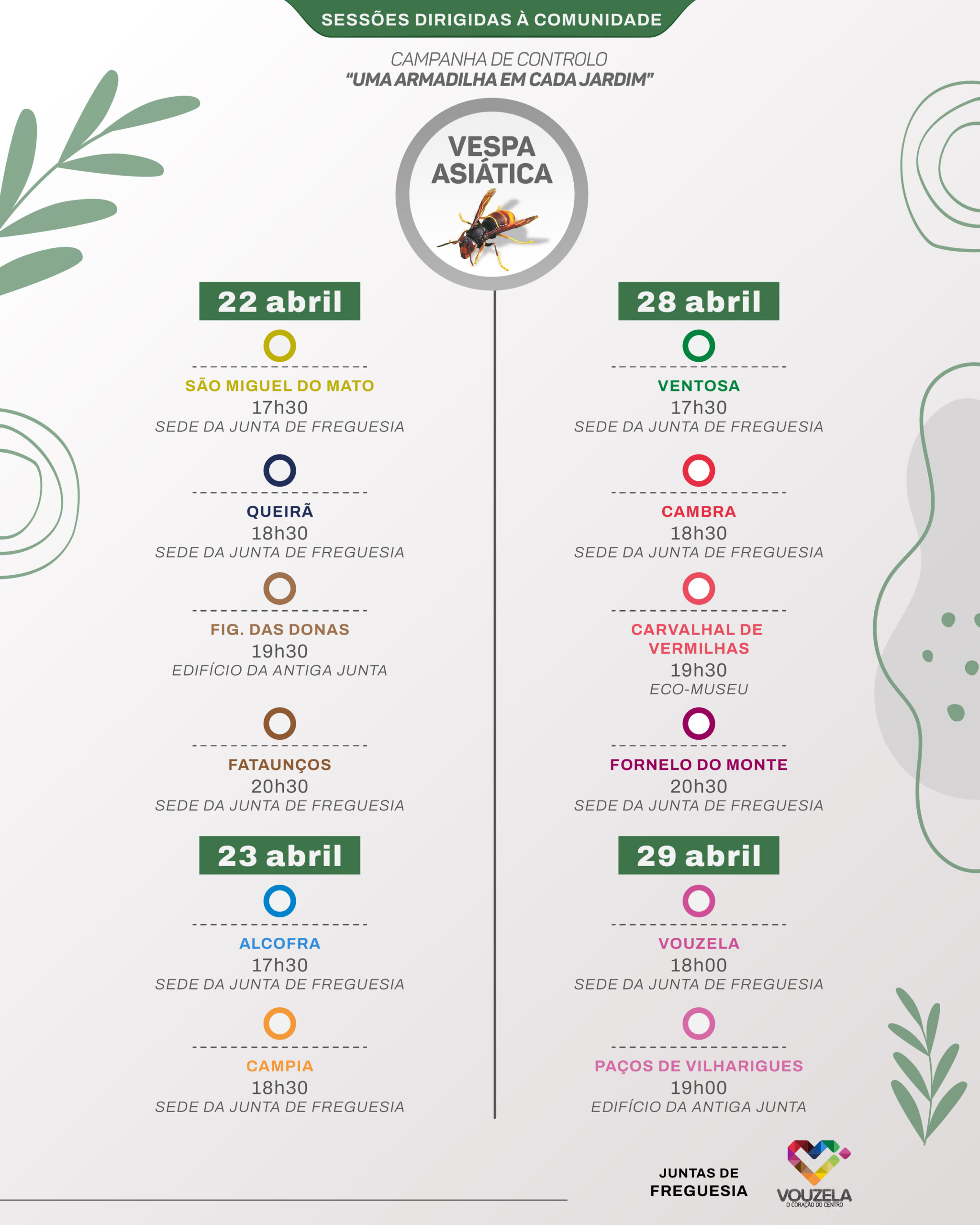 No âmbito das ações de prevenção e controlo da vespa velutina (vespa asiática) que têm vindo a ser desenvolvidas pelo Município de Vouzela, irá realizar se a iniciativa de sensibilização “Uma armadilha em cada jardim”, que irá decorrer em todas as freguesias do concelho nos dias 22, 23, 28 e 29 de abril.