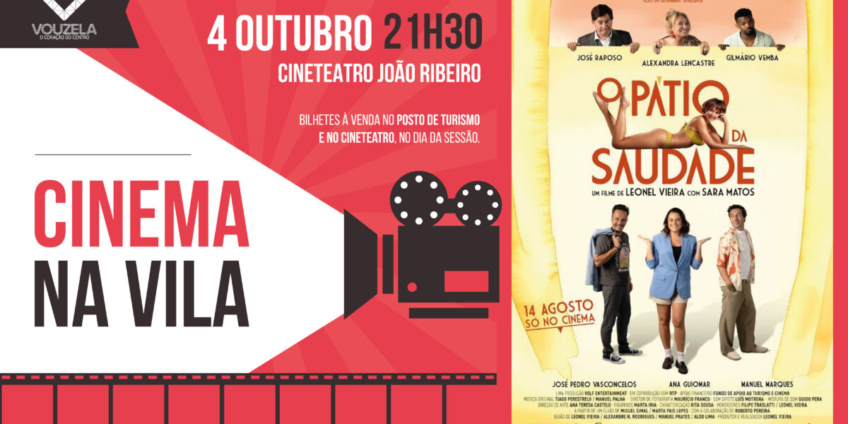 O cineteatro de Vouzela recebe no próximo sábado, dia 4 de outubro, às 21h30, o filme “O Pátio da Saudade”. Os bilhetes têm o custo de 3 euros e podem ser adquiridos antecipadamente no Posto de Turismo de Vouzela ou no próprio dia, diretamente no cineteatro. Sinopse: ao descobrir que herdou um antigo teatro, outrora palco de grandes sucessos da