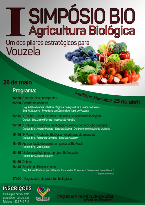 No âmbito do V Festival da Vitela de Lafões e Produtos Regionais, vai realizar-se no dia 26 de maio, a partir das 15h, o I Simpósio Bio, subordinado ao tema “Agricultura Biológia, um dos pilares estratégicos para Vouzela”. Os oradores convidados irão debruçar-se sobre as temáticas “oportunidades e desafios da Agricultura Biológica”, “controlo e certificação do modo de produção biológica”,
