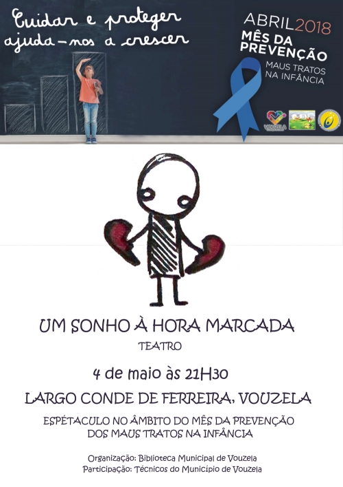 A Câmara Municipal de Vouzela vai apresentar no dia 4 de maio, pelas 21h30, no Largo Conde Ferreira, em Vouzela, a peça de teatro “Um Sonho à Hora Marcada”. A iniciativa insere-se no âmbito do programa Mês da Prevenção dos Maus Tratos na Infância e é protagonizada pelos técnicos da autarquia. O espetáculo tem entrada livre.