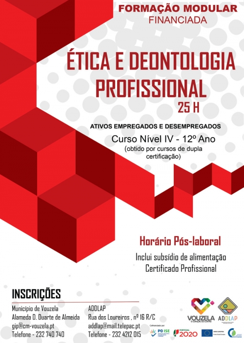 O Município de Vouzela e a Associação de Desenvolvimento Dão, Lafões e Alto Paiva (ADDLAP) vão promover uma ação de formação modular financiada em Ética e Deontologia Profissional. Trata-se de um curso de Nível IV – 12º ano e destina-se a ativos empregados e desempregados. Decorrerá em horário pós-laboral e os formandos terão direito a subsídio de alimentação e certificado