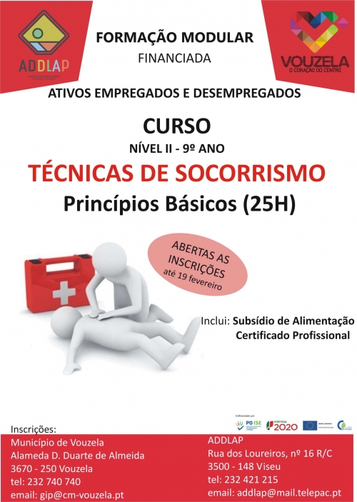 O Município de Vouzela e a Associação de Desenvolvimento Dão, Lafões e Alto Paiva (ADDLAP) vão promover uma ação de formação modular financiada em Técnicas de Socorrismo. Trata-se de um curso de Nível II – 9º ano e destina-se a ativos empregados e desempregados. As inscrições decorrem até ao dia 19 de fevereiro e poderão ser feitas na Câmara Municipal,