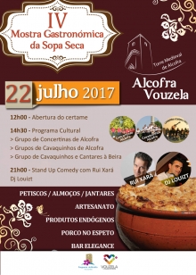 A Junta de Freguesia de Alcofra e o Município de Vouzela vão promover, no dia 22 de julho, a IV Mostra Gastronómica da Sopa Seca. O evento pretende promover e valorizar aquele que é um dos principais ex-libris gastronómicos da freguesia e do concelho, a sopa seca de Alcofra. A mostra começa pelas 12h, na torre medieval, e a partir