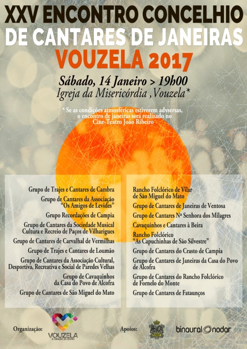 O Município de Vouzela vai promover, no dia 14 de janeiro, sábado, o 25º Encontro Concelhio de Cantares de Janeiras. Para assinalar a data, para além do tradicional encontro de cantares, a autarquia, em parceria com a Binaural Nodar, irá lançar uma publicação, constituída por livro e CD, que reúne e celebra os encontros de Cantares de Janeiras e Reis