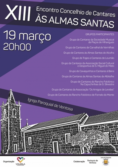 A freguesia de Ventosa vai receber, no próximo dia 19 de março, a décima terceira edição do Encontro Concelhio de Cantares às Almas Santas. A iniciativa é promovida pela Câmara Municipal de Vouzela, em colaboração com a Junta de Freguesia e com a Paróquia de Ventosa. O programa começa pelas 19h00, com os grupos participantes a recriarem a tradição do