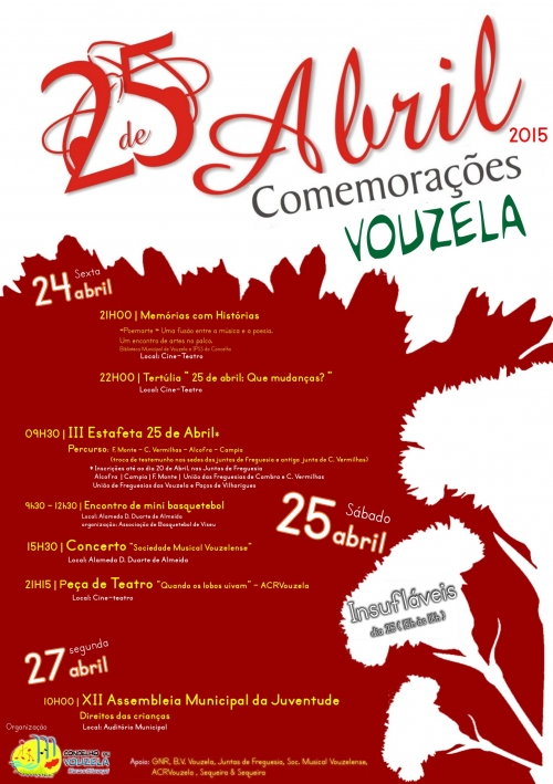 O Município de Vouzela vai assinalar o Dia da Liberdade de 24 a 27 de abril com um conjunto de iniciativas destinadas à população em geral. Espetáculos de música e teatro, uma tertúlia, provas desportivas e a assembleia municipal da juventude são algumas das propostas do programa de 2015, distribuídas por vários locais e equipamentos da vila. O programa começa