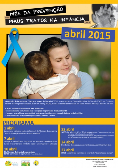 A Comissão de Proteção de Crianças e Jovens em Risco de Vouzela (CPCJ), com o apoio de todos os seus parceiros, associa-se ao Mês de Prevenção dos Maus Tratos na Infância e Juventude, comemoração que decorre durante o mês de abril, em todo o território nacional e internacional. Com o objetivo de despertar a consciência da comunidade para o seu