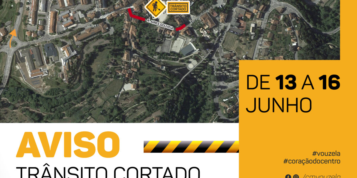 O Município de Vouzela informa que, de 13 a 16 de junho, devido a trabalhos diversos, o trânsito irá estar cortado na Rua Aires Gouveia, sendo apenas permitido o acesso a residentes e peões. A alternativa para entrar na vila, aos condutores que vêm da zona industrial de Monte Cavalo e que pretendem ir para as proximidades da Câmara Municipal,