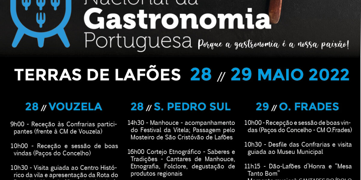 No próximo fim de semana, dias 28 e 29 de maio, Lafões vai acolher o Dia Nacional da Gastronomia Portuguesa com um vasto conjunto de iniciativas que pretendem fazer sobressair a importância da gastronomia local. Visitas guiadas, palestras e degustações são algumas das iniciativas que fazem parte de um programa que se estende por dois dias ,nos concelhos de Vouzela,