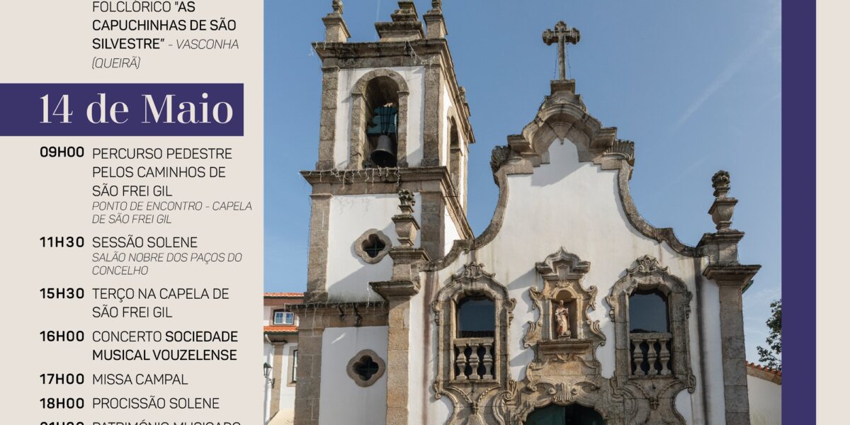 Arrancam, no dia 13 de maio, as Festas em Honra de São Frei Gil, em Vouzela. As comemorações começam com a procissão das velas, às 20h30 e pelas 21h atua o racho folclórico “As Capuchinhas de São Silvestre”. No dia seguinte, 14 de maio, dia de São Frei Gil, às 9h terá início o percurso pedestre com partida da Capela