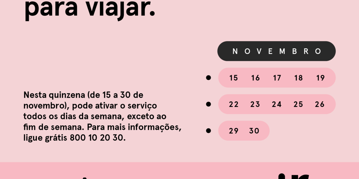 Até 30 de novembro, ao invés das quartas e sextas-feiras de manhã, o serviço de transporte flexível IR E VIR estará disponível todos os dias úteis. Para mais informações ligue 800 10 20 30.