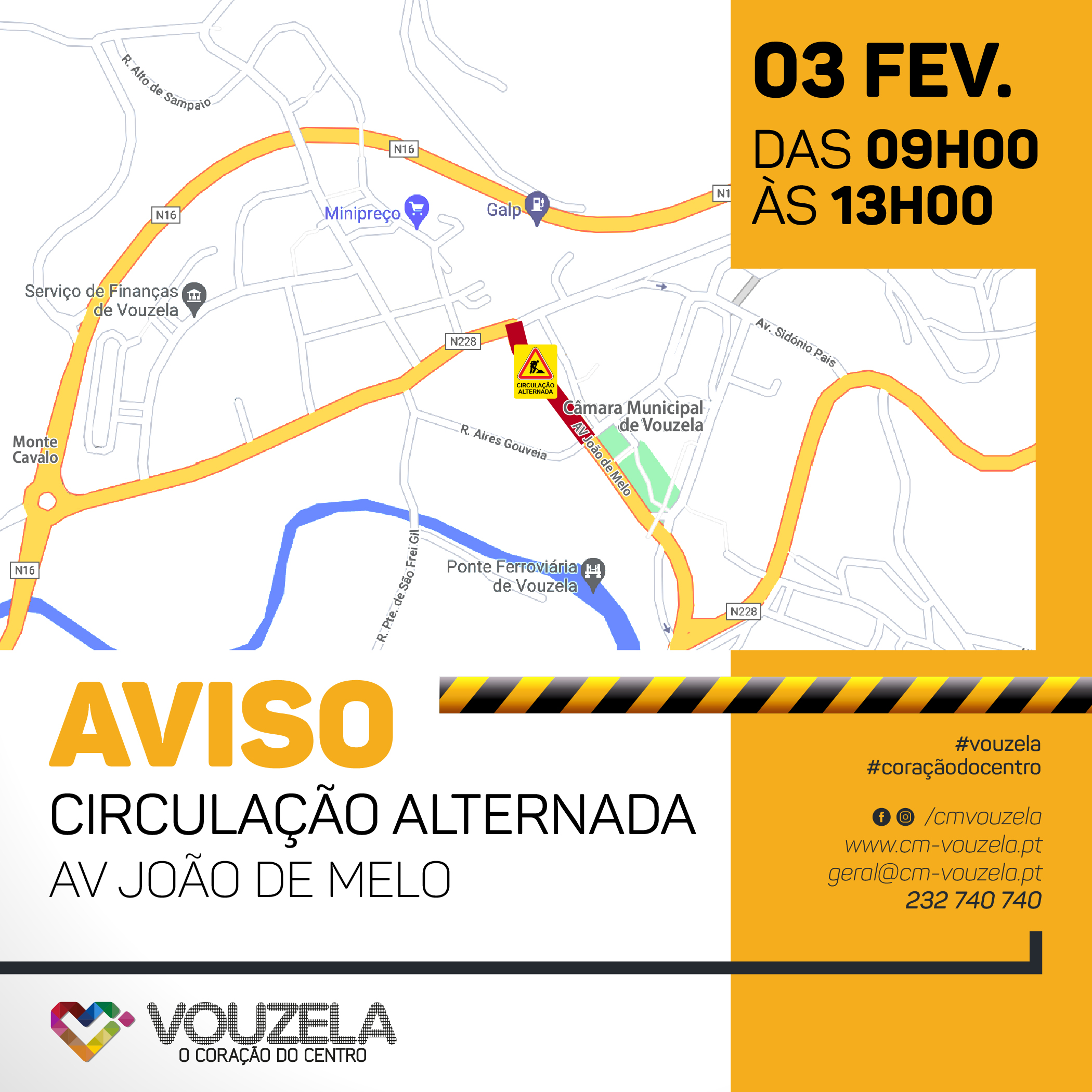 O Município de Vouzela informa que, devido às obras do Pólo Criativo de Vouzela, a circulação na Av. João de Melo será feita de forma alternada durante o período da manhã do dia 3 de fevereiro (quinta-feira).