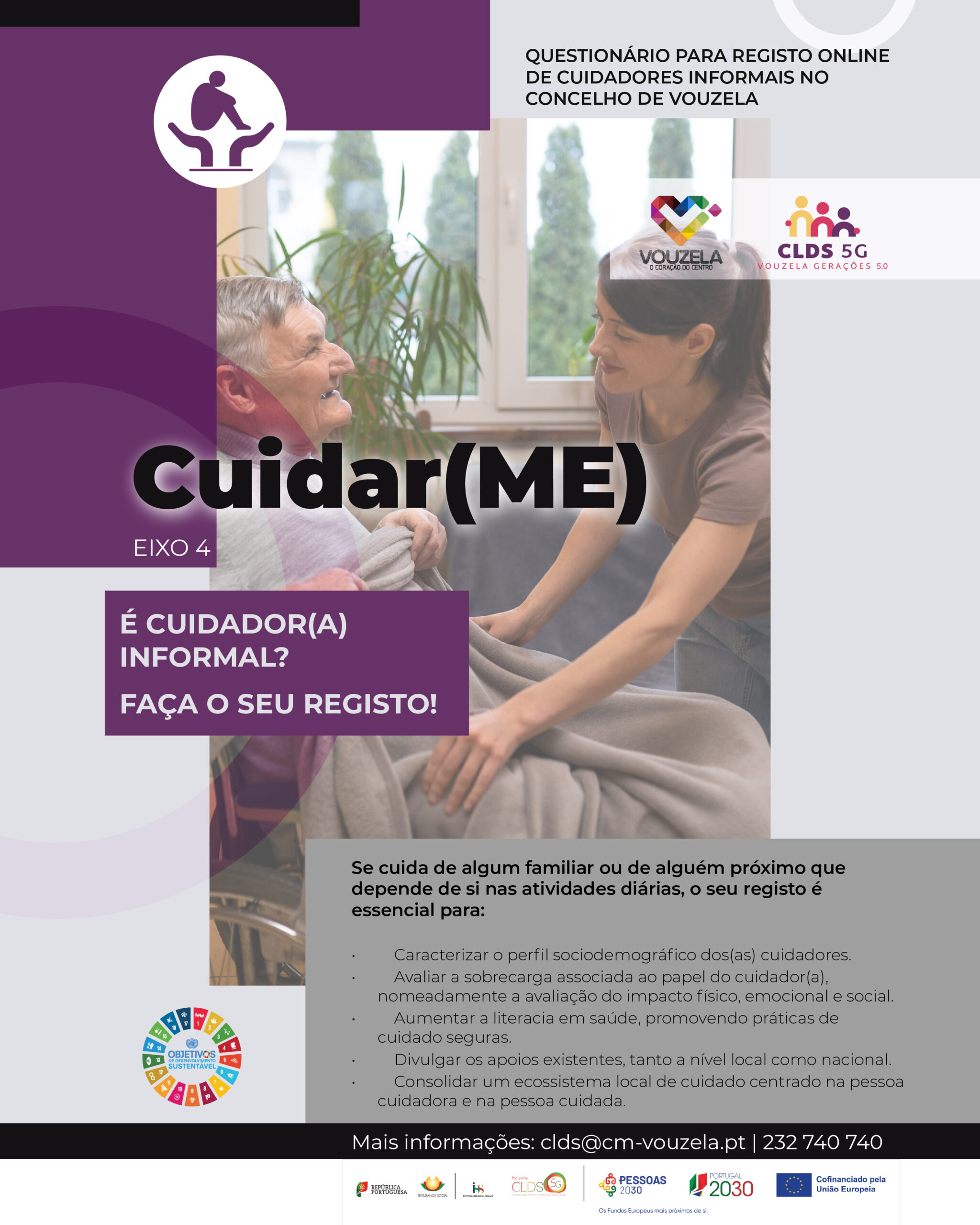 No âmbito do CLDS 5G – Vouzela Gerações 5.0, a Câmara Municipal de Vouzela vai implementar o Cuidar(ME) – Programa Municipal de Apoio aos(às) Cuidadores(as) Informais, integrado no Eixo 3 – Promoção da autonomia, envelhecimento ativo e longevidade. Este projeto assenta numa abordagem inovadora e integrada do cuidado, colocando no centro tanto a pessoa cuidadora como a pessoa cuidada.