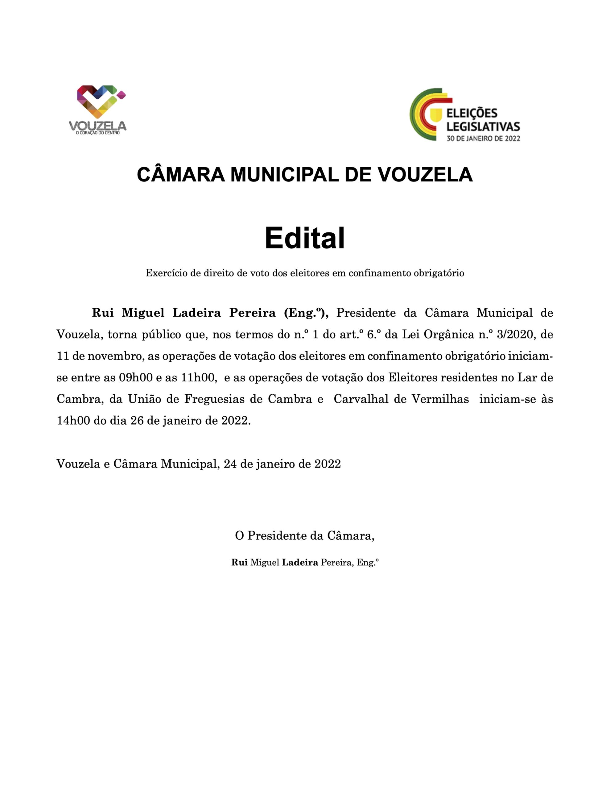 Rui Miguel Ladeira Pereira (Eng.º), Presidente da Câmara Municipal de Vouzela, torna público que, nos termos do n.º 1 do art.º 6.º da Lei Orgânica n.º 3/2020, de 11 de novembro, as operações de votação dos eleitores em confinamento obrigatório iniciam-se entre as 09h00 e as 11h00, e as operações de votação dos Eleitores residentes no Lar de Cambra, da União de Freguesias de Cambra e Carvalhal de Vermilhas iniciam-se às 14h00 do dia 26 de janeiro de 2022.