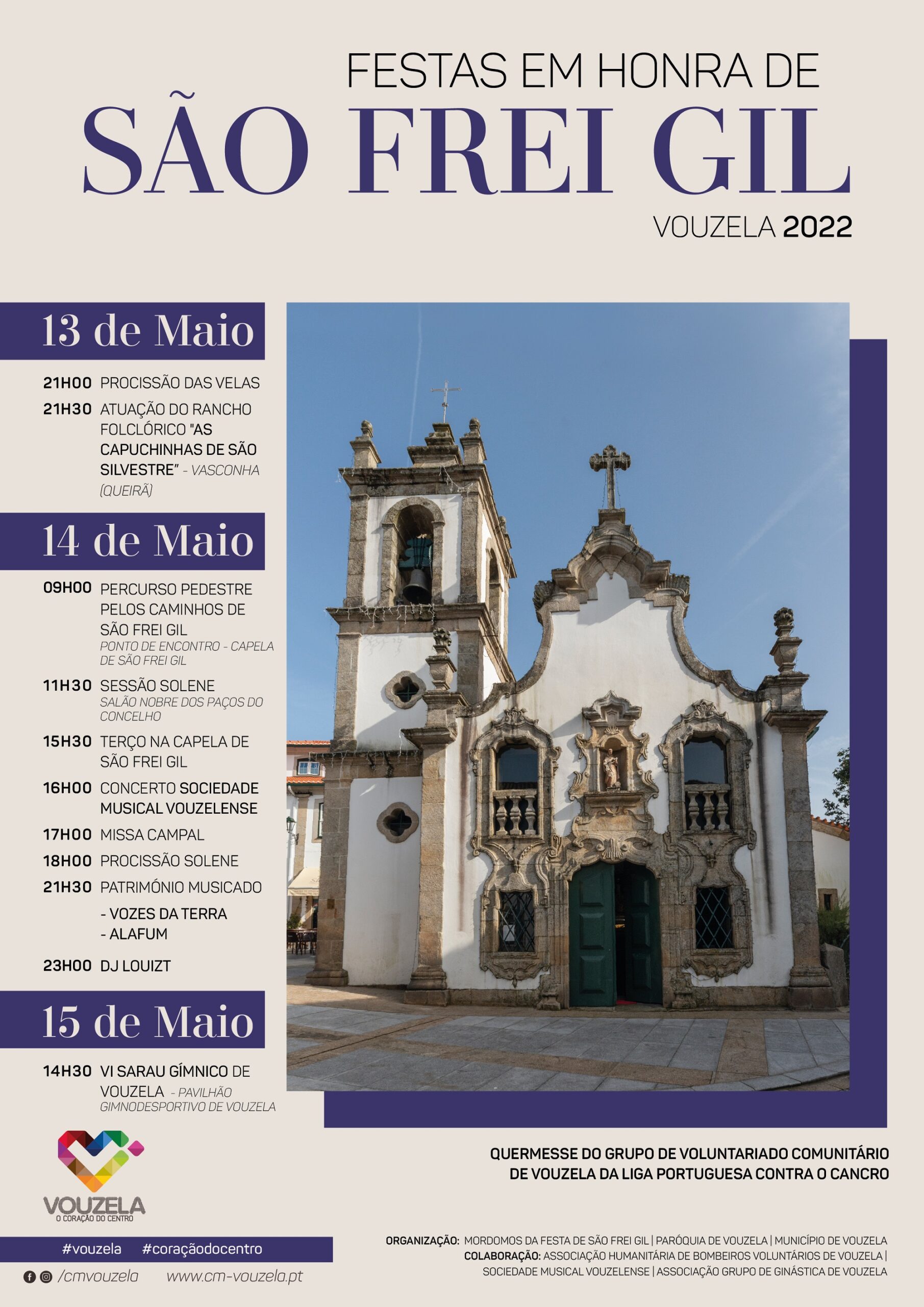 No dia seguinte, 14 de maio, dia de São Frei Gil, às 9h terá início o percurso pedestre com partida da Capela de São Frei Gil e, às 11h30, realiza-se a sessão solene no Salão Nobre dos Paços do Concelho, em que o Município de Vouzela presta homenagem a Rodrigo Magalhães, a Alberto Correia, à empresa Metalúrgica da Seixa e ao Rancho Folclórico e Etnográfico “As Capuchinhas de S. Silvestre”.