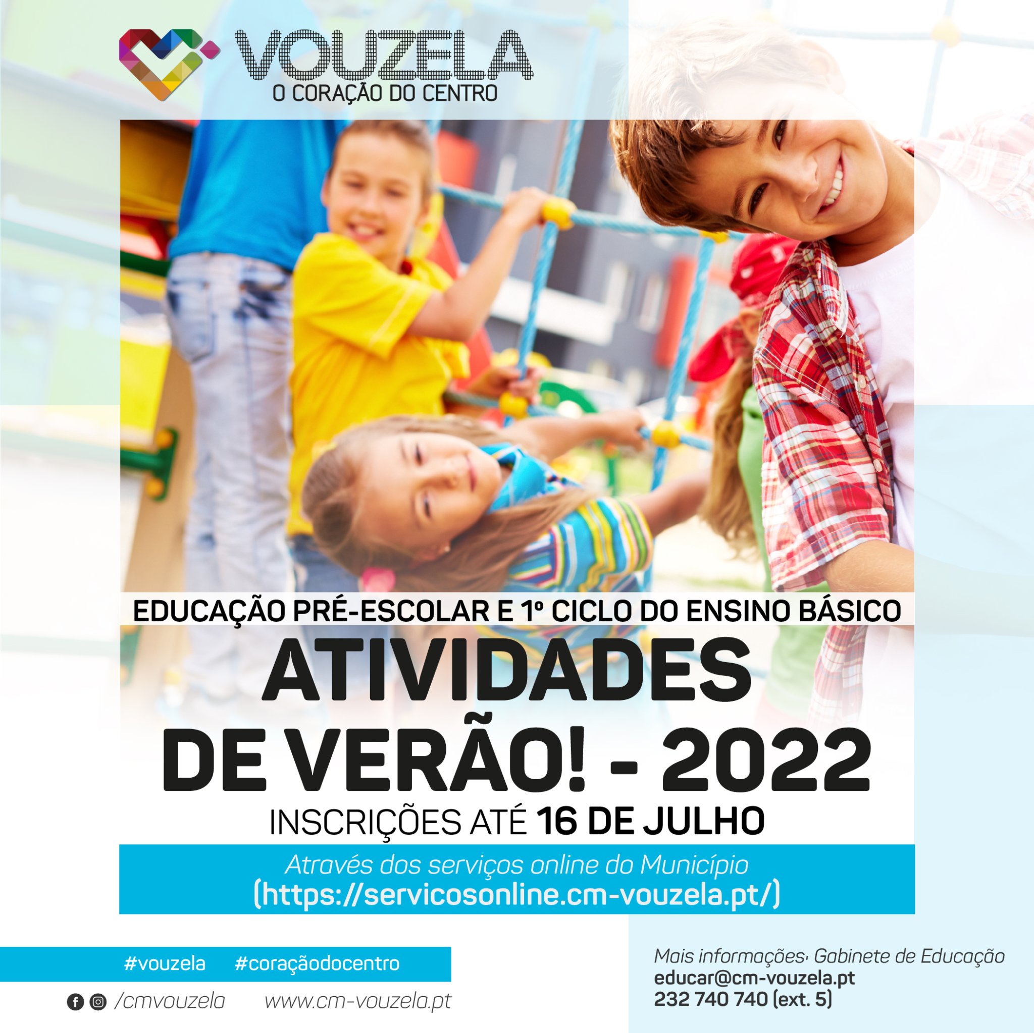O Município de Vouzela informa que estão a decorrer as inscrições para as Atividades de Verão, a desenvolver entre 16 e 26 de agosto de 2022, destinadas às crianças da Educação Pré-escolar e do 1º Ciclo do Ensino Básico.