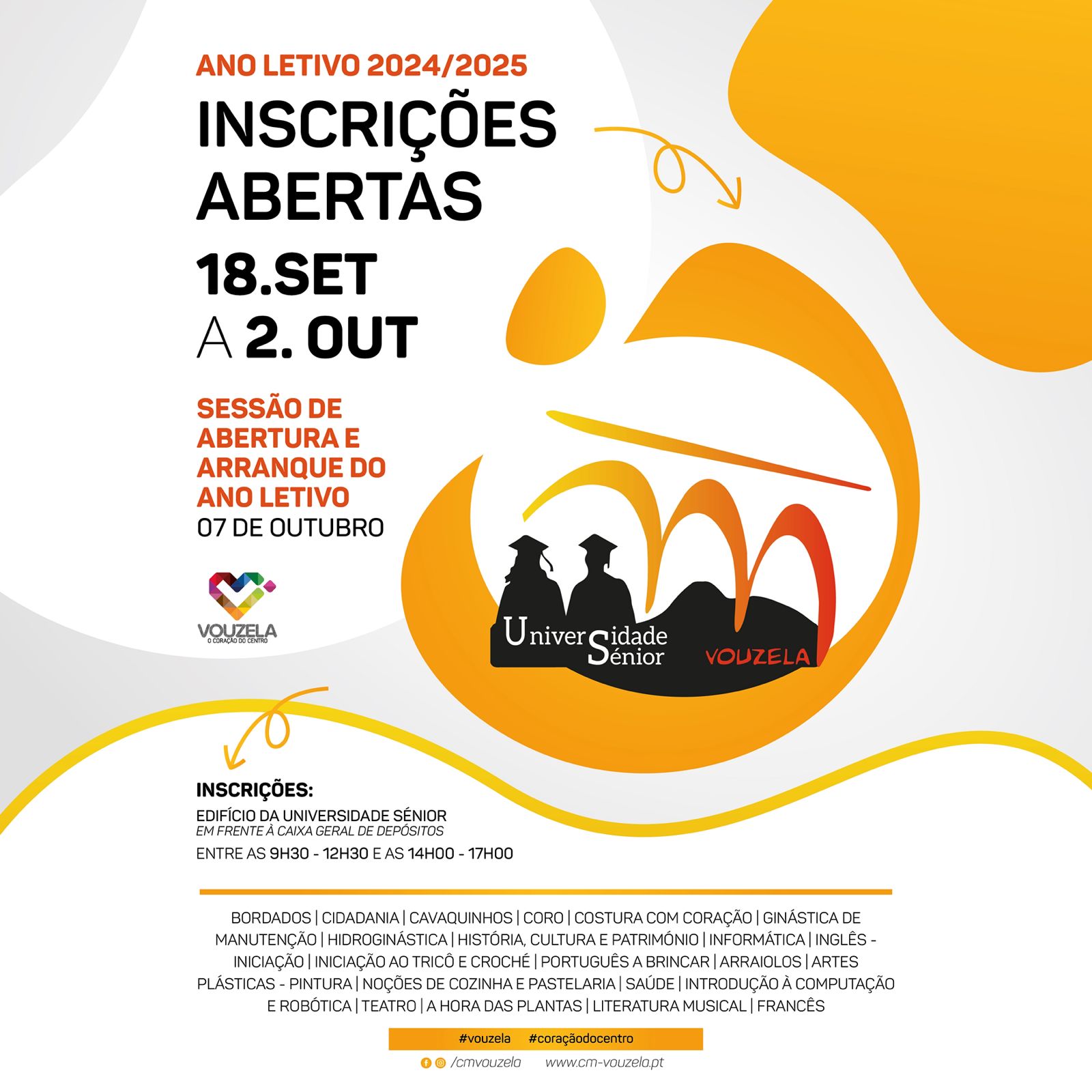 A Câmara Municipal de Vouzela informa que decorrem, até ao dia 2 de outubro, as inscrições para a Universidade Sénior, ano letivo 2024/ 2025.