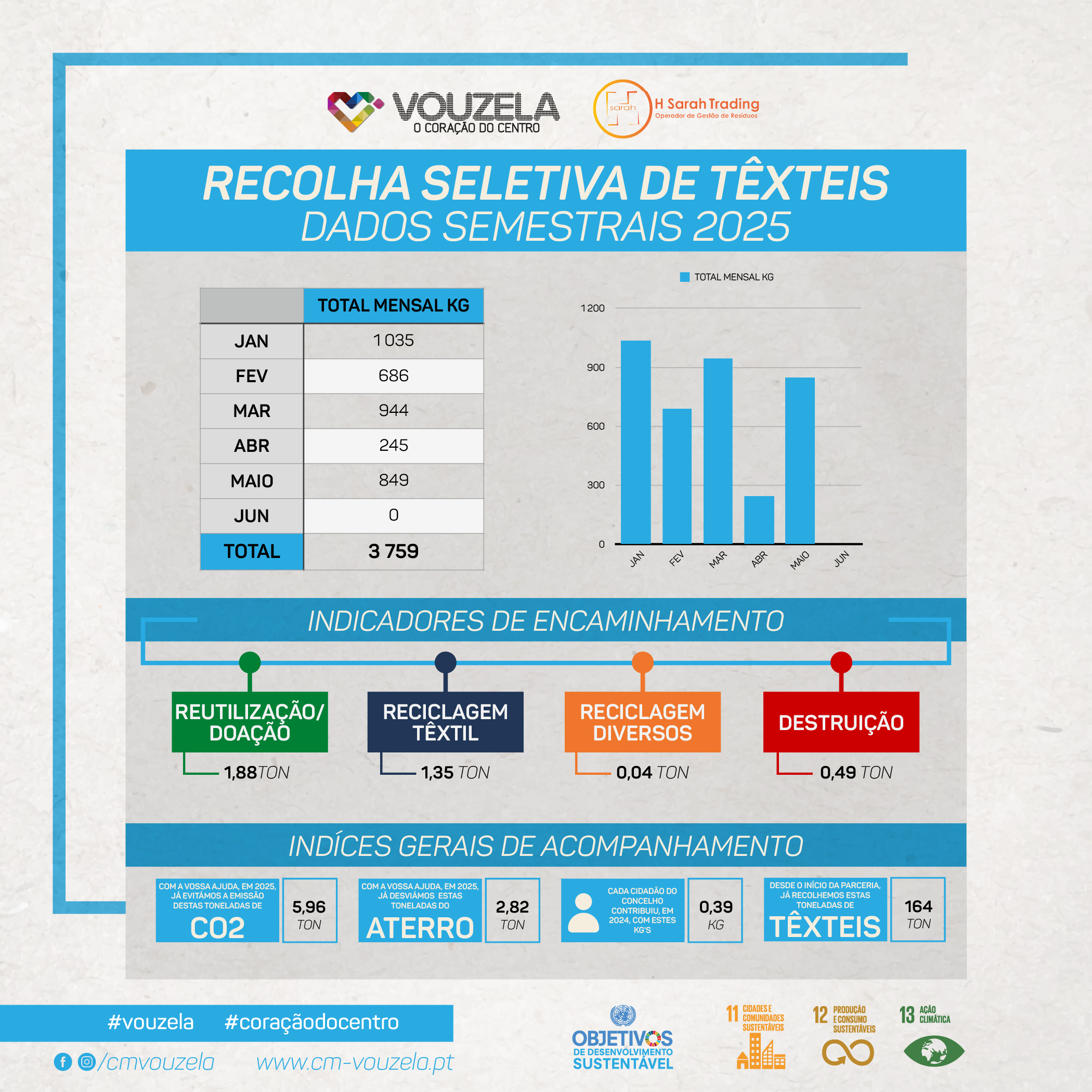 Entre janeiro e junho de 2025, foram recolhidos 3.759 kg de resíduos têxteis no concelho de Vouzela. Esta operação permitiu evitar o encaminhamento de 2,82 toneladas para aterro sanitário, contribuindo para a redução de cerca de 5,96 toneladas de emissões de CO₂ para a atmosfera.