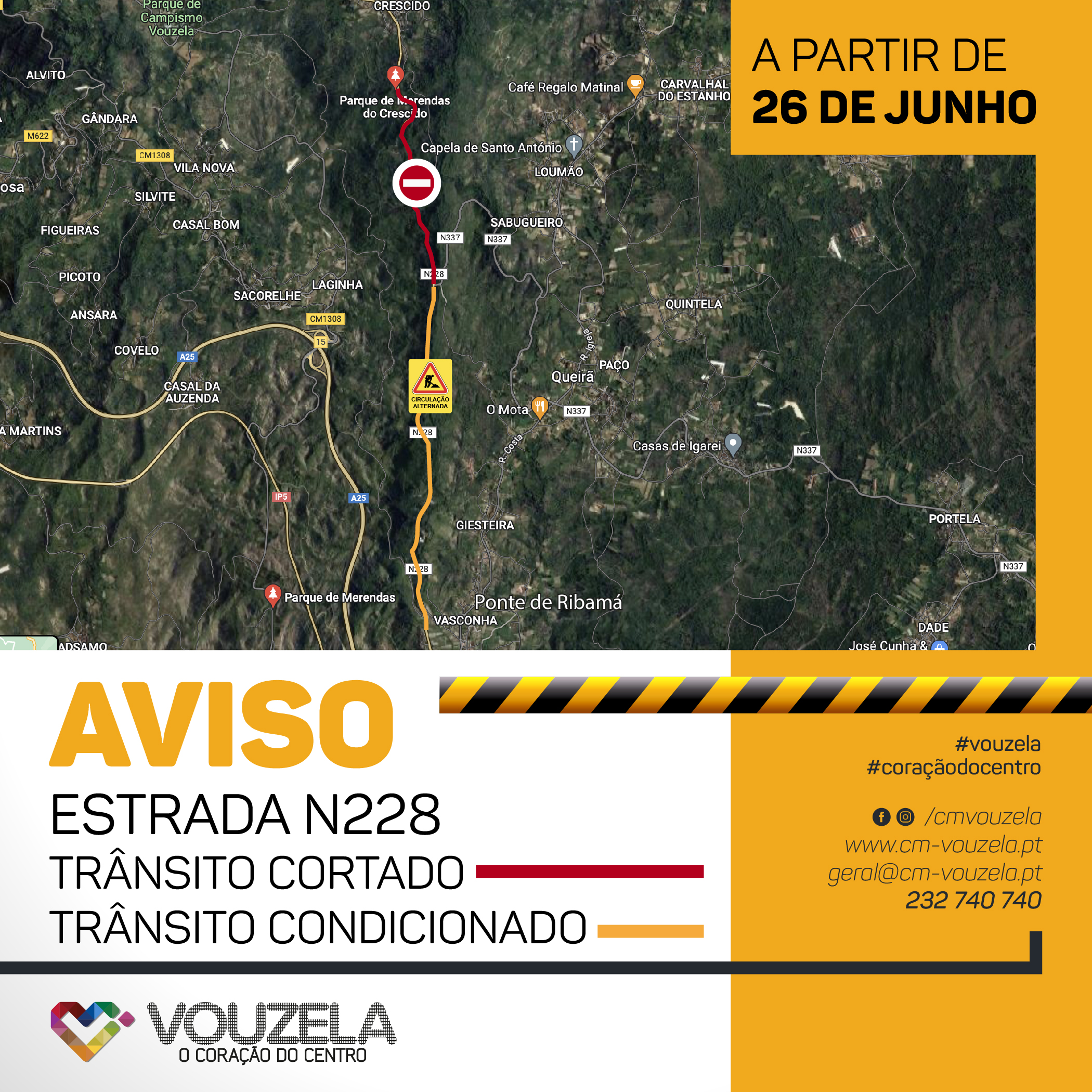 A Câmara Municipal de Vouzela informa que, no âmbito da empreitada de estabilização de taludes na ER228, e para a realização dos trabalhos previstos, a Infraestruturas de Portugal irá fazer reajustes ao condicionamento do trânsito em vigor, bem como o alargamento do prazo para a realização dos trabalhos.