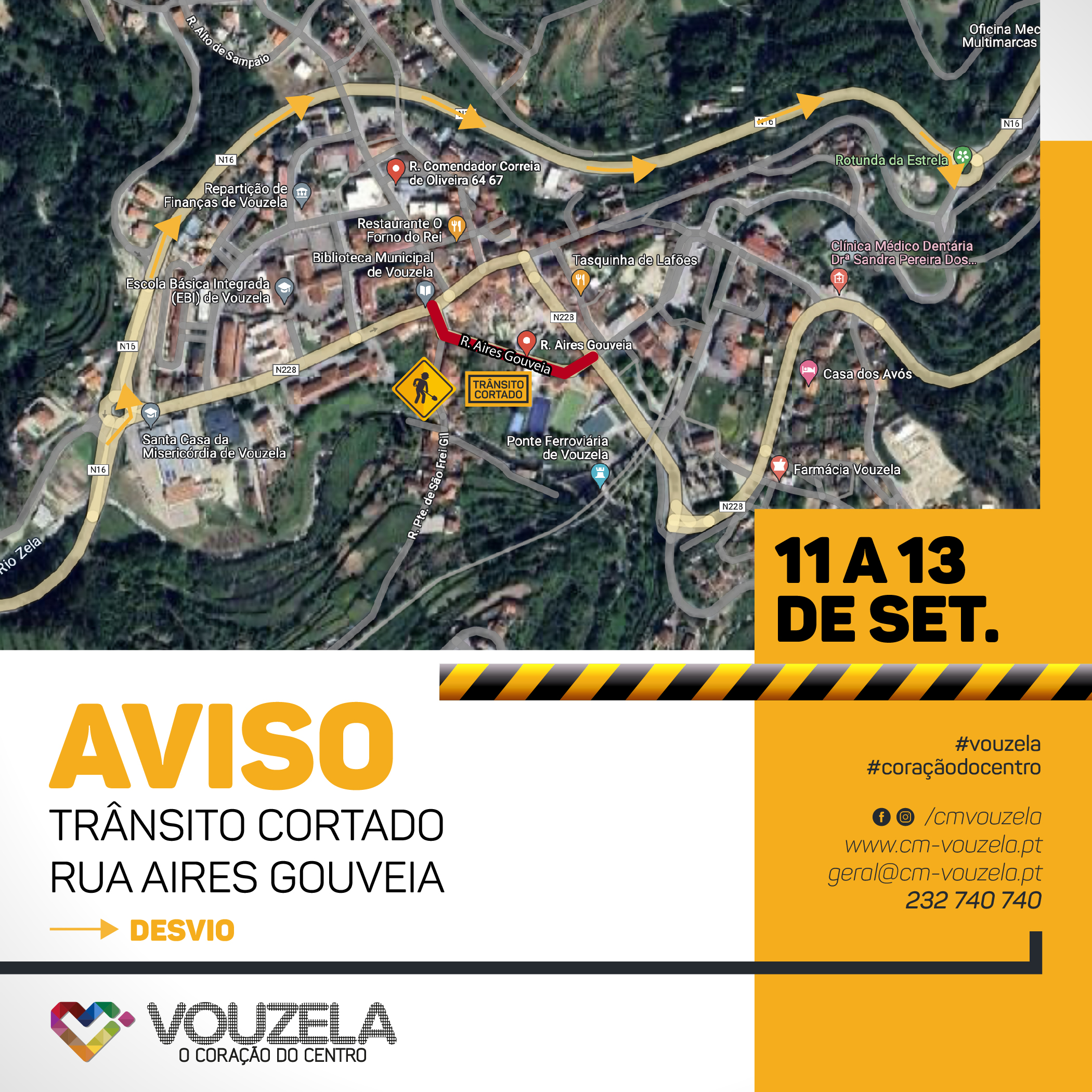 O Município de Vouzela informa que, de 11 a 13 de setembro, devido a trabalhos na rede de água e saneamento, o trânsito irá estar cortado na Rua Aires Gouveia, sendo apenas permitido o acesso a residentes e peões.