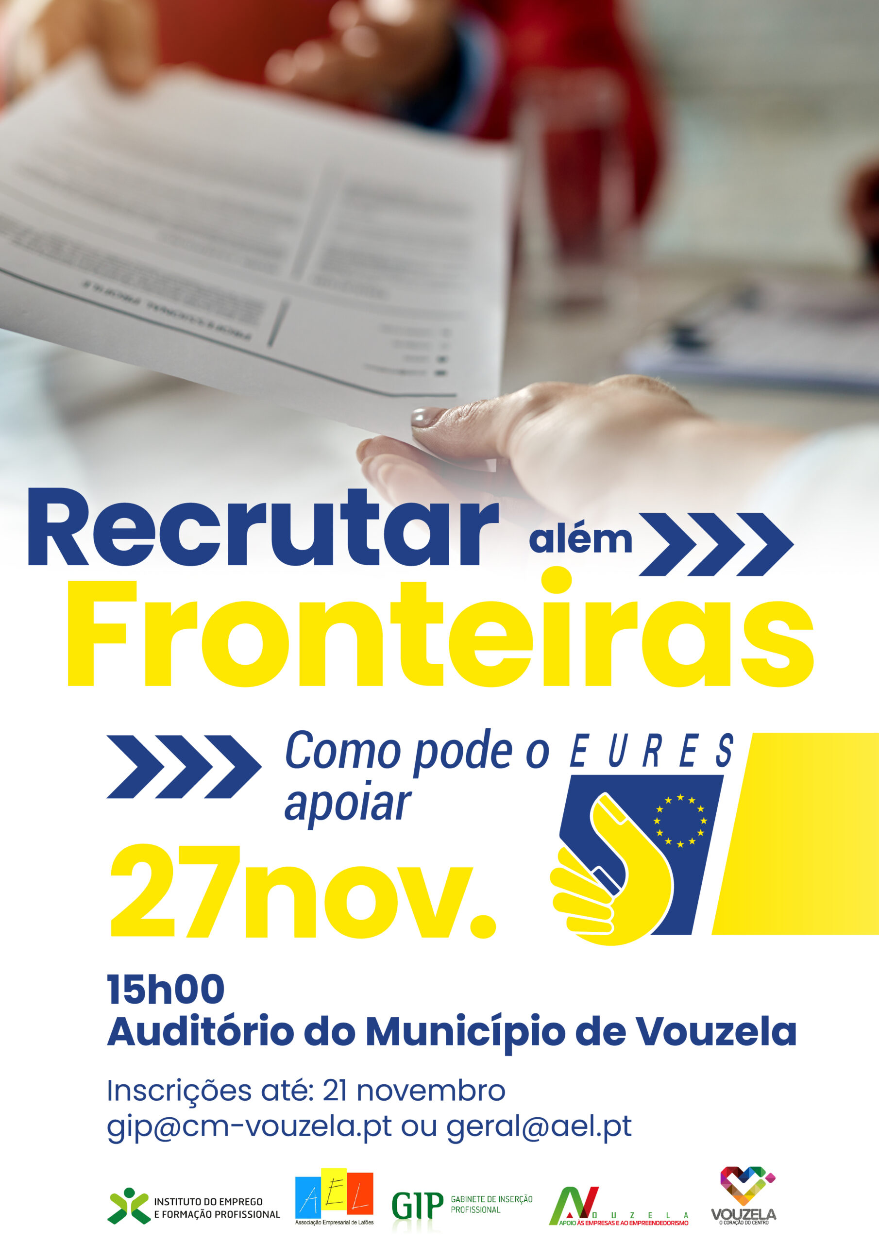 O Município de Vouzela, em parceria com o IEFP – Instituto do Emprego e Formação Profissional e a Associação Empresarial de Lafões, vai promover no dia 27 de novembro, pelas 15h, no Auditório Municipal de Vouzela, a sessão “Recrutar Além Fronteiras – Como pode o EURES apoiar”.