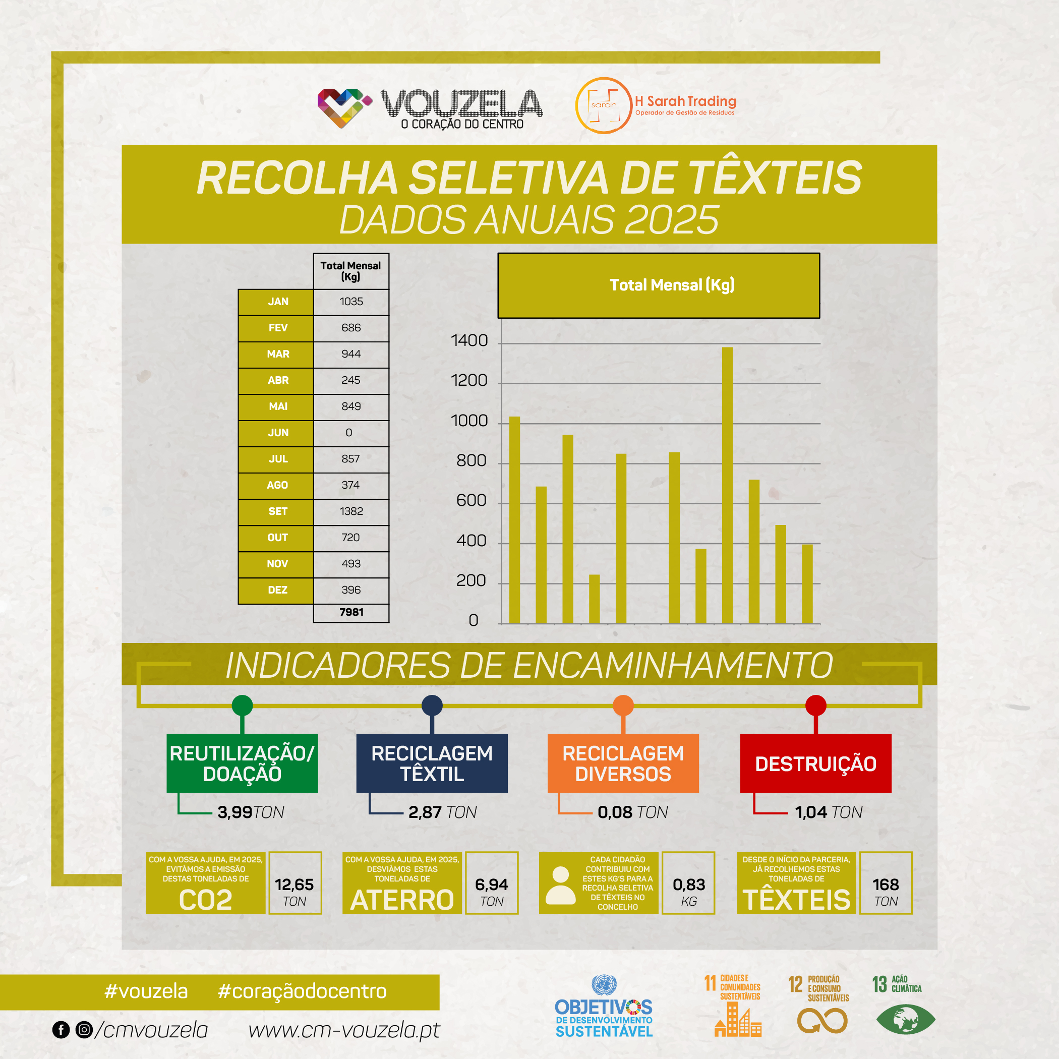 Desde o início da parceria com a empresa responsável pela recolha, já foram recolhidas cerca de 168 toneladas de resíduos têxteis no concelho de Vouzela, reforçando o compromisso do Município com a economia circular, a sustentabilidade ambiental e a valorização de resíduos.